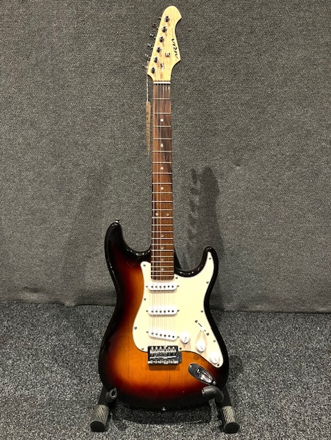 Aria STG ‘Strat’ in dark sunburst. Locked down tram, can be unlocked. Professionally set up, new strings, Low mid action.